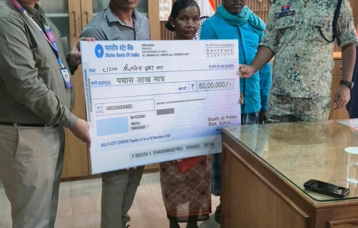 30.03.2026 को आरक्षक क्रमांक 204 राजेन्द्र कुमार नाग के साथ उनके पिता श्री गंगाधर नाग एवं उनकी माता श्रीमती दयमती नाग को श्री किरण चव्हाण, पुलिस अधीक्षक, जिला सुकमा एवं श्री प्रवीण झा, शाखा प्रबंधक, भारतीय स्टेट बैंक, सुकमा द्वारा बीमा राशि रुपये 50,00,000/- (पचास लाख) का भुगतान किया गया।